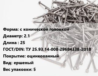 Гвоздь с конической головкой 2.1х25 ГОСТ: ТУ 25.93.14-008-29684338-2018 оцинкованный ершеный 5