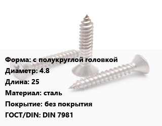 Саморез с полукруглой головкой D=4.8 L=25 сталь без покрытия ГОСТ: DIN 7981, шт цена от 2.79 ₽ / кг, где купить, условия доставки в Казани и Казанской области