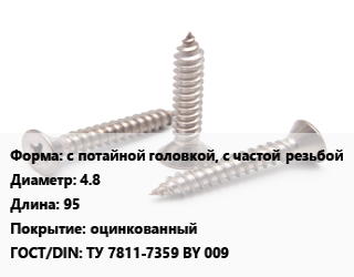 Саморез с потайной головкой, с частой резьбой D=4.8 L=95 оцинкованный ГОСТ: ТУ 7811-7359 BY 009