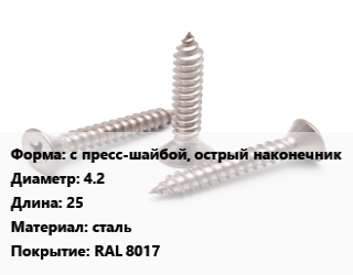 Саморез с пресс-шайбой, острый наконечник D=4.2 L=25 сталь RAL 8017, упаковка 1000 шт цена от 404.54 ₽ / кг, где купить, условия доставки в Казани и Казанской области
