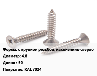 Саморез с крупной резьбой, наконечник-сверло D=4.8 L=50 RAL 7024, шт цена от 3.83 ₽ / кг, где купить, условия доставки в Казани и Казанской области