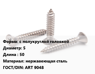 Саморез с полукруглой головкой D=5 L=50 нержавеющая сталь ГОСТ: ART 9048, упаковка 1000 шт цена от 656.69 ₽ / кг, где купить, условия доставки в Казани и Казанской области