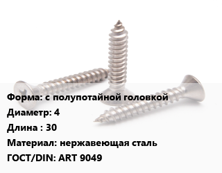 Саморез с полупотайной головкой D=4 L=30 нержавеющая сталь ГОСТ: ART 9049, упаковка 45 шт цена от 69.3 ₽ / кг, где купить, условия доставки в Казани и Казанской области