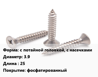 Саморез с потайной головкой, с насечками D=3.9 L=25 фосфатированный, упаковка 12000 шт цена от 2 602 ₽ / кг, где купить, условия доставки в Казани и Казанской области
