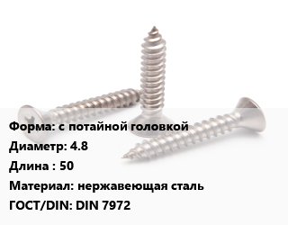 Саморез с потайной головкой D=4.8 L=50 нержавеющая сталь ГОСТ: DIN 7972