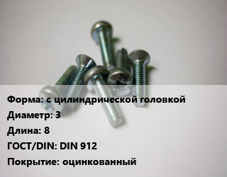 Винт с цилиндрической головкой 3х8 DIN 912 оцинкованный, 8.8, кг цена от 20.59 ₽ / кг, где купить, условия доставки в Казани и Казанской области