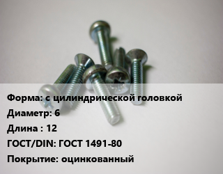 Винт с цилиндрической головкой 6х12 ГОСТ 1491-80 оцинкованный, упаковка 5 кг, кг цена от 192.28 ₽ / кг, где купить, условия доставки в Казани и Казанской области