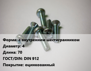Винт с внутренним шестигранником 4х70 DIN 912 оцинкованный, 8.8, цена за шт, кг цена от 11.7 ₽ / кг, где купить, условия доставки в Казани и Казанской области