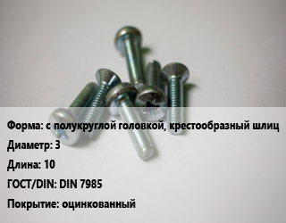 Винт с полукруглой головкой, крестообразный шлиц 3х10 DIN 7985 оцинкованный
