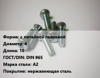 Винт с потайной головкой 4х10 DIN 965 Сталь: А2 нержавеющая сталь, цена за шт, кг цена от 2.66 ₽ / кг, где купить, условия доставки в Казани и Казанской области