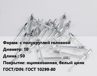 Заклепка с полукруглой головкой 10х50 оцинкованная, белый цинк ГОСТ: ГОСТ 10299-80