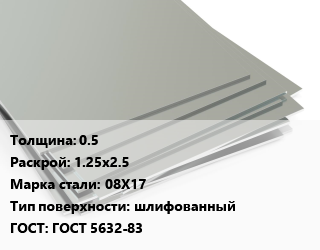 Лист нержавеющий 0.5 1.25х2.5 Сталь: 08Х17 Тип:шлифованный ГОСТ 5632-83