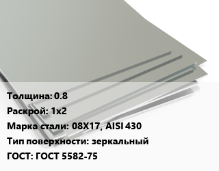 Лист нержавеющий 0.8 1х2 Сталь: 08Х17, AISI 430 Тип:зеркальный ГОСТ 5582-75